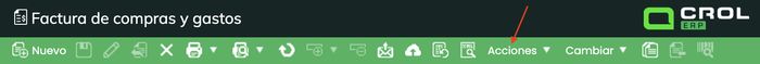 En la transacción de factura de compras y gastos, el menú Acciones concentra las operaciones que puedes realizar sobre el documento una vez guardado. Las acciones disponibles en esta sección son las siguientes: