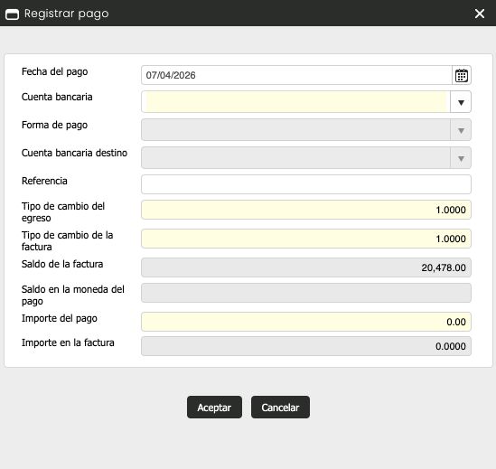 - Forma de pago: Método utilizado para realizar el pago. Las opciones disponibles incluyen transferencia electrónica, efectivo, entre otras formas configuradas en el sistema. El pago con cheque no está disponible en esta opción.