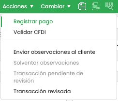 Una vez registrada una factura de compras y gastos en Crol ERP, es posible ejecutar diversas acciones sobre ella: registrar un pago, validar el CFDI ante el SAT, enviar observaciones, solventar comentarios y marcar el documento como revisado. Este artículo describe cada acción y los pasos para ejecutarla.