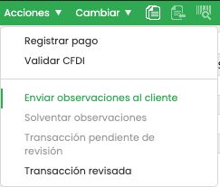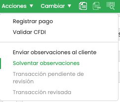 Esta acción es utilizada por el cliente o el usuario responsable de la factura para responder a las observaciones enviadas previamente por la firma de contadores o el área de contabilidad. Permite documentar la atención dada a cada observación y mantener un historial del proceso de revisión. Para solventar observaciones, sigue estos pasos: