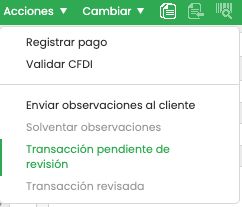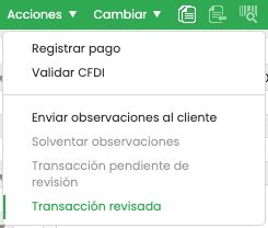 Esta acción marca la factura como revisada, confirmando que el documento ha sido validado y aprobado por el área responsable. Al aplicarla, el estado de la transacción cambia a Revisada, indicando que puede continuar con su proceso contable o de pago. Para marcar la transacción como revisada, sigue estos pasos: