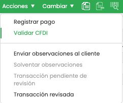 - Selecciona la opción Validar CFDI. El sistema se conectará con el SAT y realizará la consulta del comprobante. El resultado de la validación se mostrará en el encabezado de la transacción.