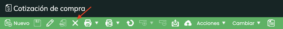 La cancelación de una cotización de compra elimina su efecto dentro del sistema y deja el documento marcado como Cancelado. Esta operación es irreversible, por lo que se solicita confirmar la fecha de cancelación y opcionalmente registrar un comentario que explique el motivo. Si la cotización ya fue referenciada en una factura de compra y gasto, la cancelación no estará disponible hasta que se elimine la referencia. Para cancelar una cotización, sigue estos pasos: