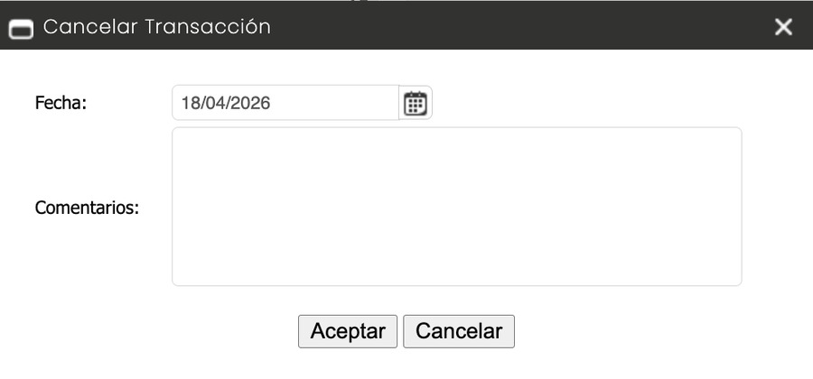 - Comentarios: Campo de texto libre para registrar el motivo de la cancelación u observaciones relevantes. Su uso es opcional pero recomendable para mantener trazabilidad.