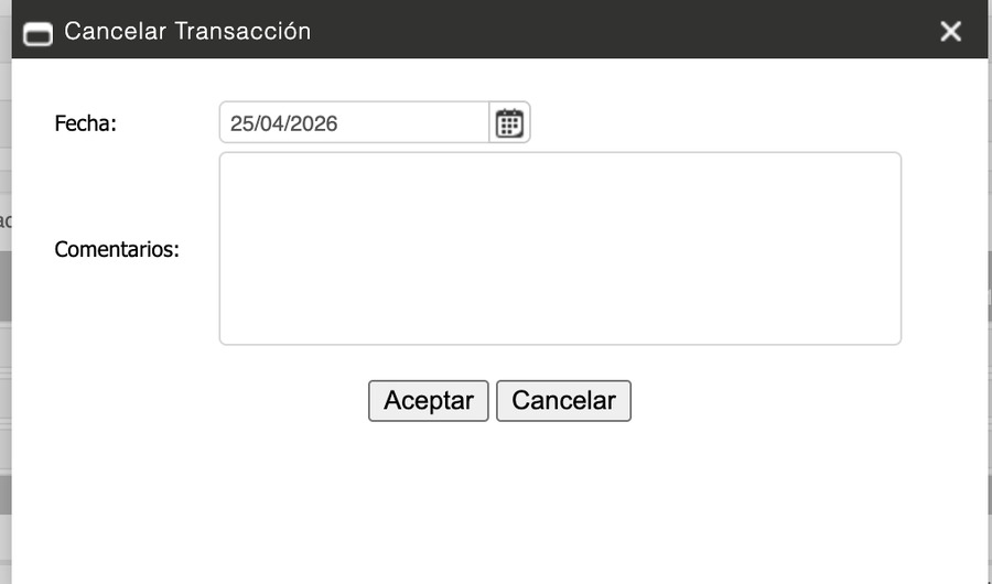 - Fecha: Fecha en la que se efectúa la cancelación. Por defecto muestra la fecha del sistema; puedes ajustarla con el selector de calendario si la cancelación corresponde a un día distinto.