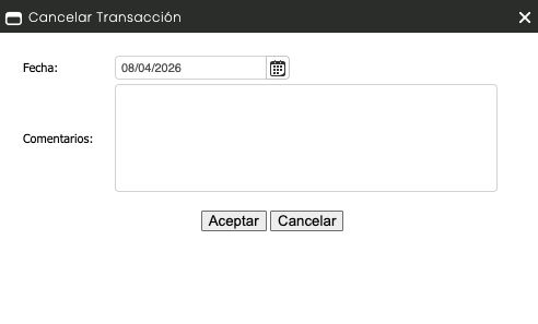 - Comentarios: Campo de texto libre para registrar el motivo de la cancelación u observaciones relevantes. Su uso es opcional pero recomendable para mantener trazabilidad.