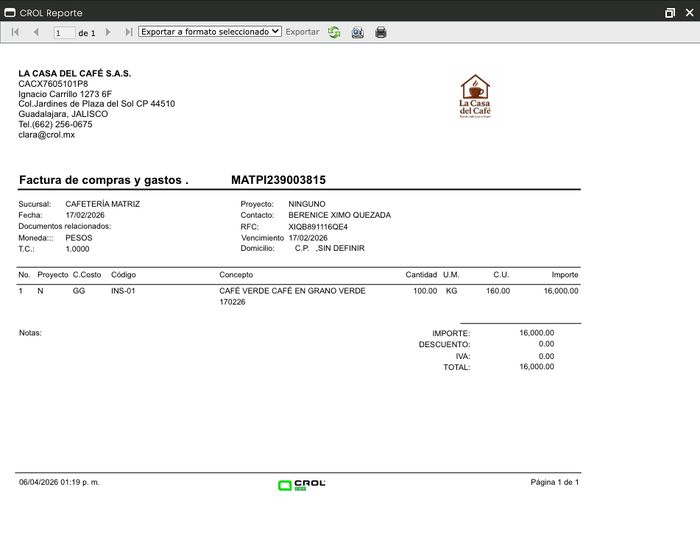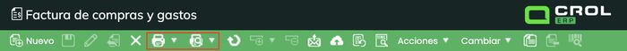 Crol ERP permite generar una versión imprimible de la factura de compras y gastos o previsualizarla en pantalla antes de imprimirla. Este artículo describe las opciones disponibles y los pasos para acceder a ellas desde la transacción.