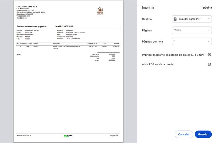 Desde la transacción de factura de compras y gastos, puedes generar documentos en formato PDF como el reporte de la factura, la póliza contable o la póliza electrónica. Estas opciones te permiten imprimir o guardar digitalmente los documentos ...