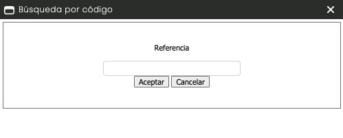 - Se abrirá el diálogo Búsqueda por código. En el campo Referencia, escanea el código de barras de la orden de compra con un lector, o escríbelo manualmente.
