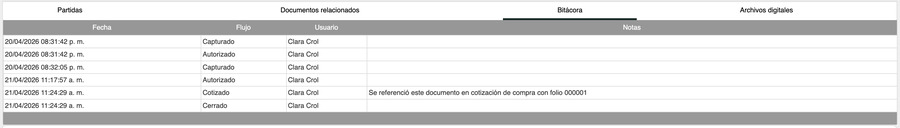 La bitácora registra el historial completo de acciones realizadas sobre la requisición desde su captura hasta su cierre. Cada cambio de flujo queda registrado con fecha, usuario y notas automáticas del sistema.