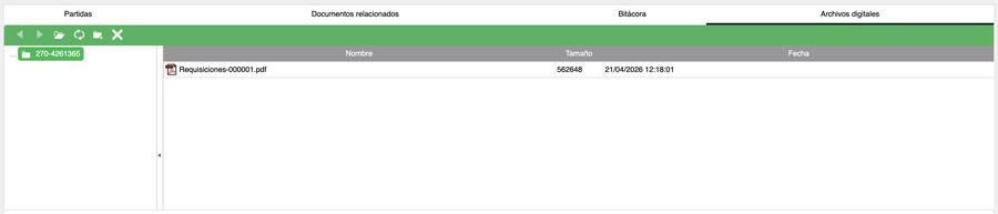 En esta área se registra y consulta la información detallada de la requisición, organizada en pestañas: Partidas, Documentos relacionados, Bitácora y Archivos digitales.