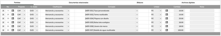 En esta pestaña se capturan los productos o servicios que se están solicitando. Cada línea representa una partida y puede describir un producto del catálogo o un concepto libre.