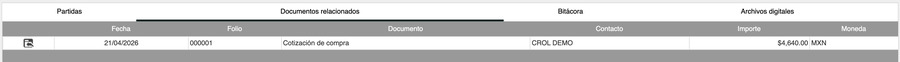 Esta pestaña muestra las transacciones generadas a partir de la requisición (cotizaciones de compra, órdenes de compra) y permite identificar rápidamente el seguimiento comercial del documento.