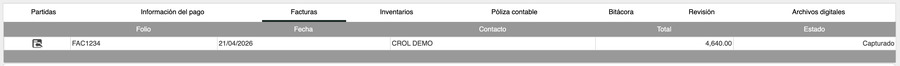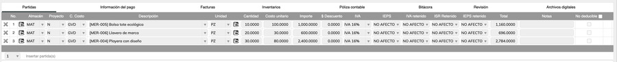 En esta pestaña se capturan los productos o servicios entregados por el contacto, con su cantidad, costo unitario, descuentos e impuestos aplicables.