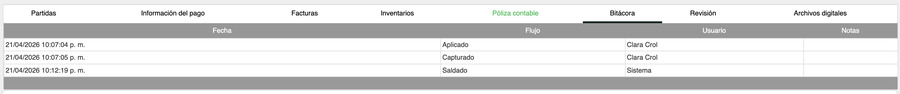 La bitácora registra el historial completo de cambios de flujo de la nota de remisión: captura, aplicación, saldado y, en su caso, cancelación. Cada cambio queda registrado automáticamente con fecha, usuario y notas del sistema.