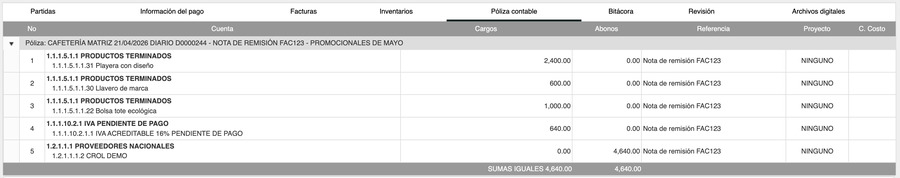 Esta pestaña muestra la póliza contable que Crol ERP genera automáticamente al aplicar la nota de remisión, con los cargos y abonos a las cuentas correspondientes según la configuración contable de la organización.