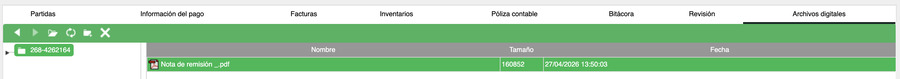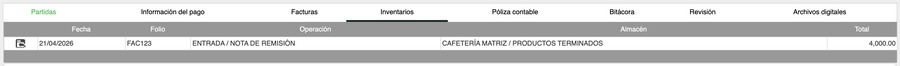 En esta área se registra y consulta la información detallada de la nota de remisión, organizada en pestañas: Partidas, Información del pago, Facturas, Inventarios, Póliza contable, Bitácora, Revisión y Archivos digitales.