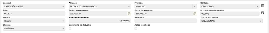 En esta sección se capturan los datos principales del documento: la sucursal y el almacén que reciben la mercancía, el proyecto al que se carga, las fechas, el folio del documento del contacto y la información fiscal y de moneda.