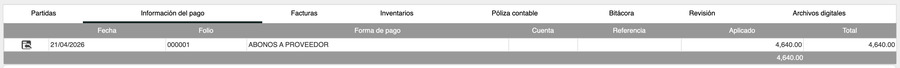 - Forma de pago: Tipo de pago aplicado (Abonos a proveedor, Transferencia, Cheque, Efectivo, etc.).