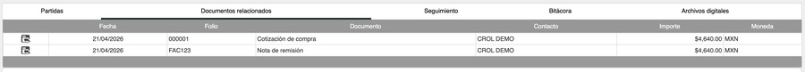 Esta pestaña muestra las transacciones generadas a partir de la orden de compra (cotizaciones, facturas, notas de remisión) y los documentos que la originaron, permitiendo identificar rápidamente la trazabilidad del documento.