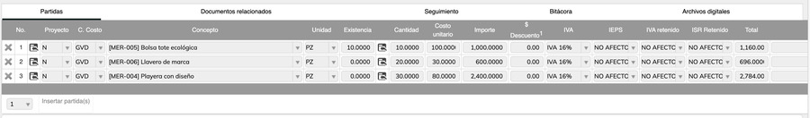 - Total: Total de la partida después de impuestos y descuentos. Se calcula automáticamente.