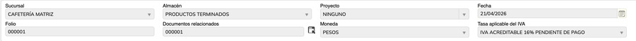 - Tasa aplicable del IVA: Configuración del IVA que aplica al documento (acreditable, retenido, pendiente de pago, etc.).
