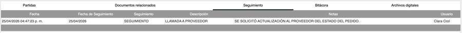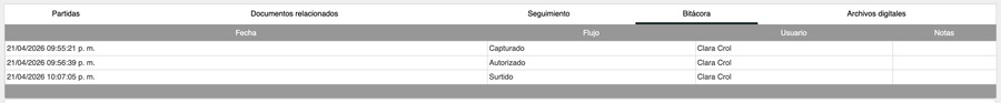 La bitácora registra el historial completo de cambios de flujo de la orden de compra desde su captura hasta su cierre. Cada cambio queda registrado automáticamente con fecha, usuario y notas del sistema.