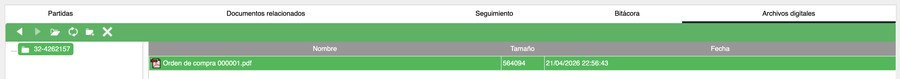 En esta área se registra y consulta la información detallada de la orden de compra, organizada en pestañas: Partidas, Documentos relacionados, Seguimiento, Bitácora y Archivos digitales.