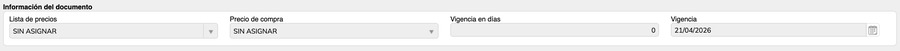 - Vigencia: Fecha hasta la cual la lista de precios seleccionada estará vigente. Se calcula automáticamente al capturar los días de vigencia. No corresponde a la vigencia del documento.